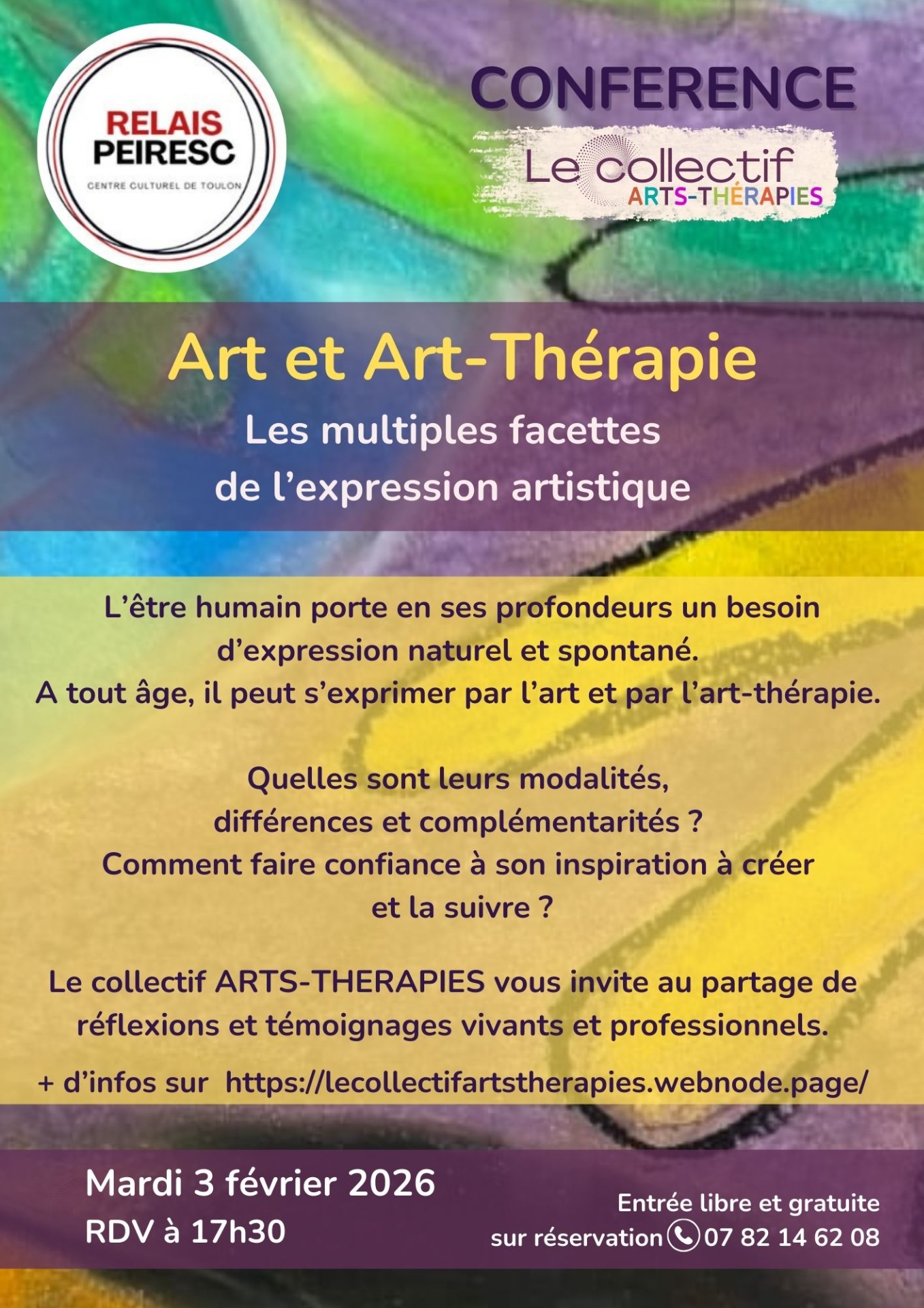 Le collectif vous donne rendez-vous le mardi 3 février 2026 pour sa nouvelle conférence sur l'art et l'art-thérapie, au Relais socio-culturel PEIRESC à Toulon.
